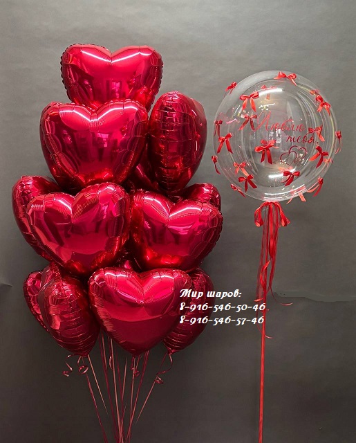 Фонтан из 15 фольгированных сердец - 5350р. Прозрачный шар баблс с индивидуальной надписью + бантики - 2250р