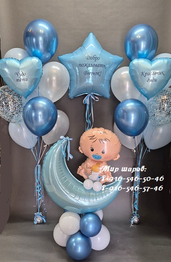 Фонтан из 5 латексных шаров без рисунка + 2 шара хром + 1 с конфетти + фольгированное сердце с индивидуальной надписью - 2160р. Фольгированная звезда с индивидуальной надписью - 1250р. Малыш на месяце - 2250р