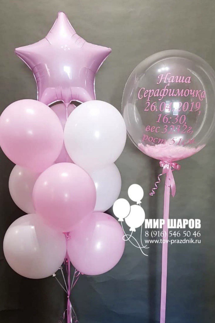 Фонтан из 9 латексных шаров + фольгированная звезда - 1980р. Прозрачный шар баблс с перьями + индивидуальная надпись - 1950р