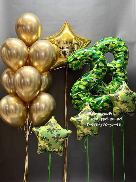 Фонтан из 10 шаров хром+ дождик - 2350р. Фольгированная звезда с индивидуальной надписью + дождик - 1300р. Фольгированные цифры "23" с грузиками - 2000р. 3 Фольгированные камуфляжные звезды с грузиками -
