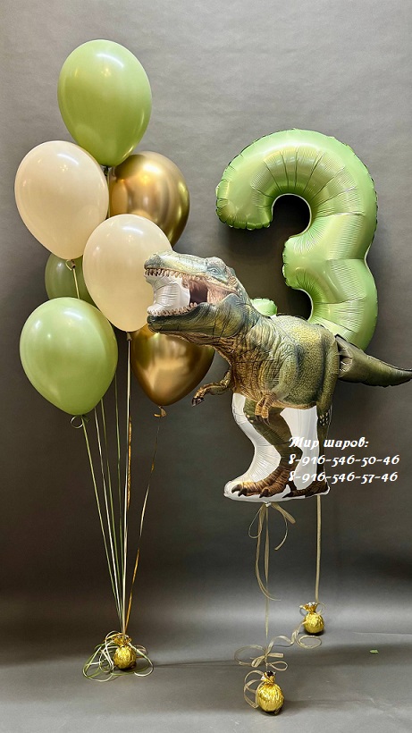 Фонтан из 5 латексных шаров без рисунка + 2 шара хром - 1390р. Фольгированная цифра с грузиком - 1000р. Фольгированный динозавр с грузиком - 1300р