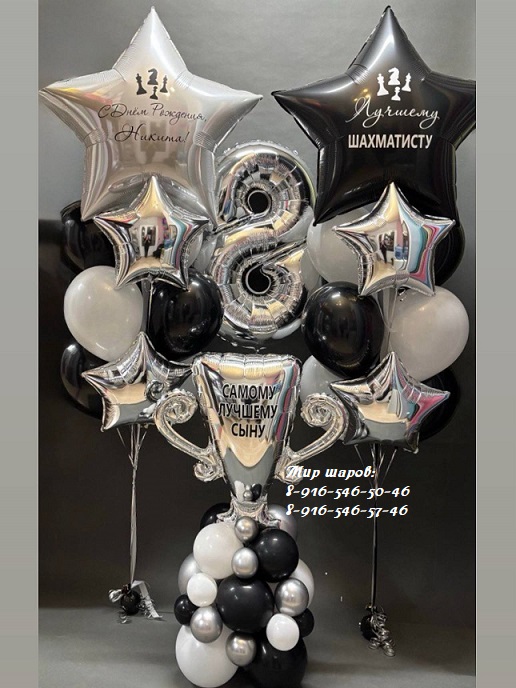 1 Фонтан из 7 латексных шаров без рисунка + 2 фольгированные звезды + фольгированная звезда "91см" с индивидуальной надписью - 3640р. Фольгированная цифра с грузиком - 1000р. Кубок на подставке с индивидуальной надписью - 1800р