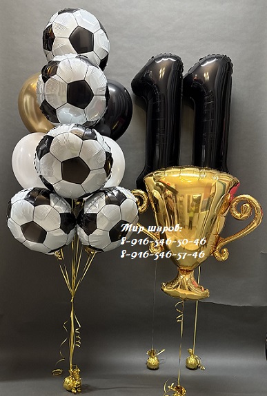 1 Фольгированная цифра с грузиком - 1000р. Фольгированный кубок с грузиком - 1000р. Фонтан из 5 фольгированных футбольных мячей + 5 латексных шаров без рисунка + 2 шара хром - 3390р